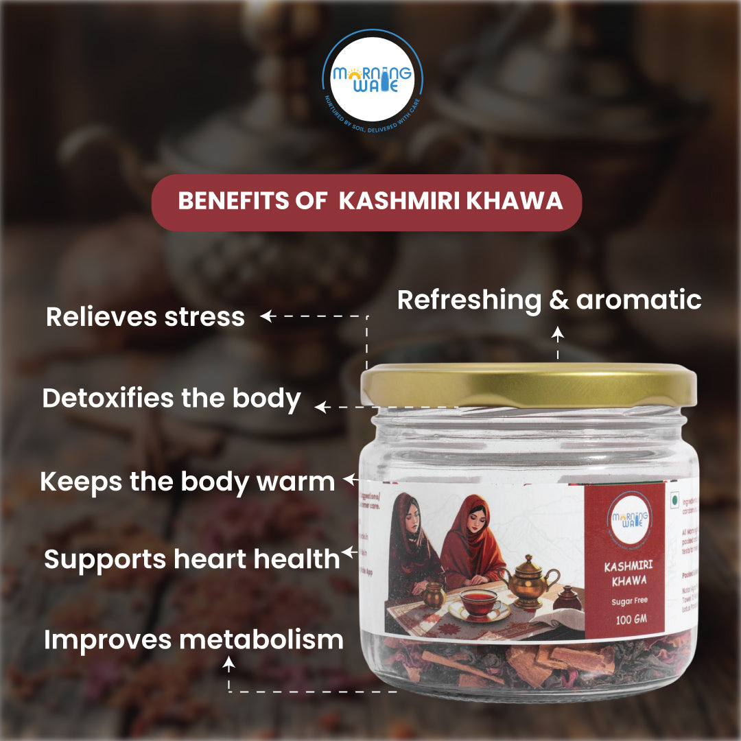Kashmiri Kahwa is a traditional wellness tea infused with saffron, cardamom, cinnamon, and almonds. It helps boost metabolism, improve digestion, strengthen immunity, and relieve stress. The perfect drink to refresh and rejuvenate your body and mind!